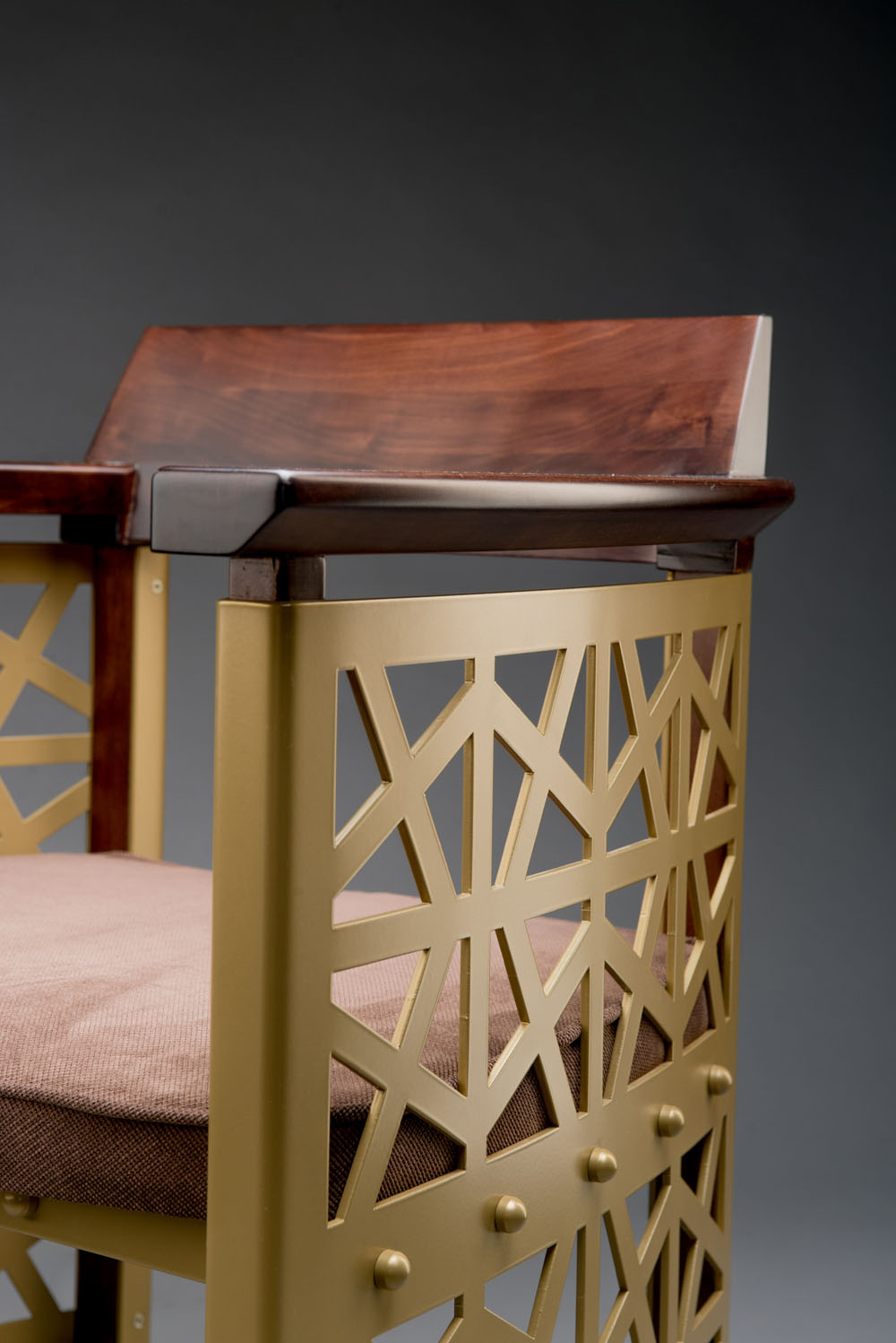 The parallel use of wood and metal are also present in these armchairs. The sides are created using the mirroring and lining of Frisian motives of smaller size. The curved and powder sintered aluminium layer creates an illusion of a lace-like coating in the armchair. I was very much intrigued by the structural opportunities provided by the perforated aluminium layer. The rivets typical for mudejar style are represented by round-head bolts in this case, ensuring fixation for the aluminium structure of the seat. The chair is most elegant when combining golden dispersion with palisander. Mahogany with antique crimson, palisander with turquoise, or several other combinations are possible to create an organic element for the interior design.